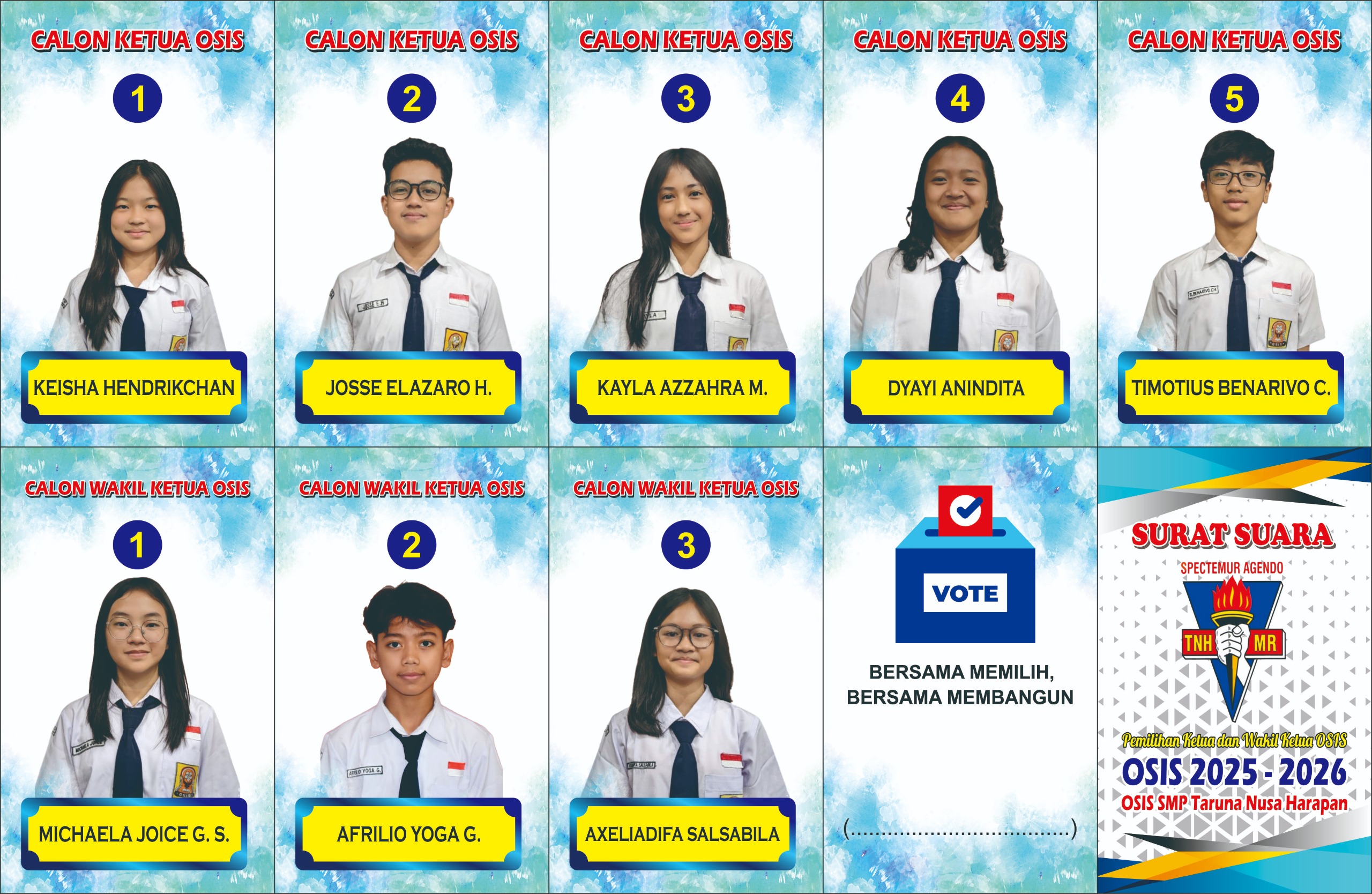 SMP Taruna Nusa Harapan Mojokerto kembali menggelar Pemilihan Ketua dan Wakil Ketua OSIS untuk Masa Bakti 2025/2026. Pemilihan yang dilaksanakan pada Kamis, 6 November 2025, ini menjadi istimewa karena untuk pertama kalinya sistem pemilihan dilakukan tidak lagi berpasangan, tetapi ketua dan wakil ketua dipilih secara terpisah.