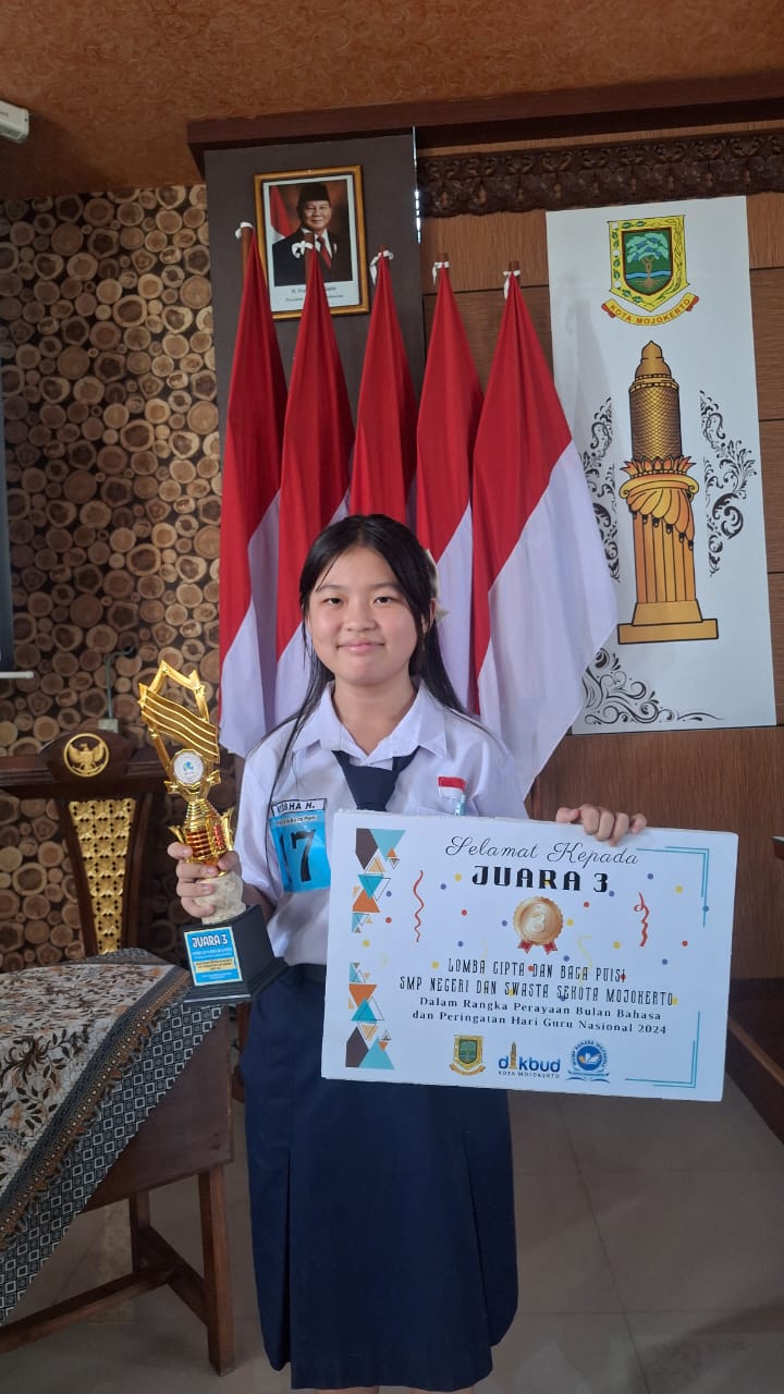 KEISHA HENDRIKCHAN SISWA KELAS VII B REBUT JUARA III LOMBA CIPTA DAN BACA PUISI DALAM RANGKA PERINGATAN BULAN BAHASA DAN HARI GURU TINGKAT KOTA MOJOKERTO